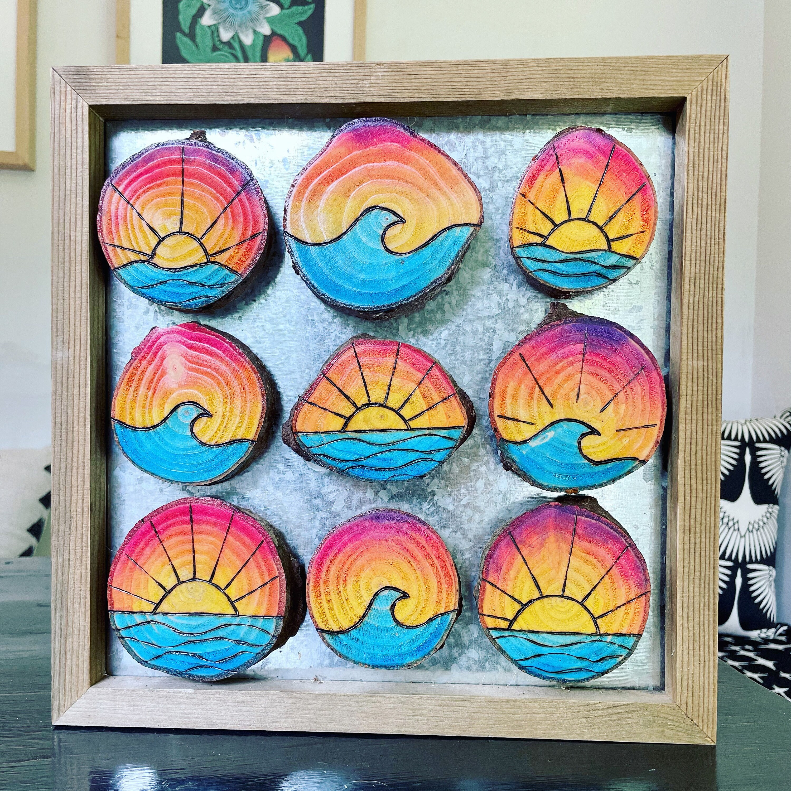 Tree Slice Magnet Sunset Wave Design Wood Burned Handmade Etsy